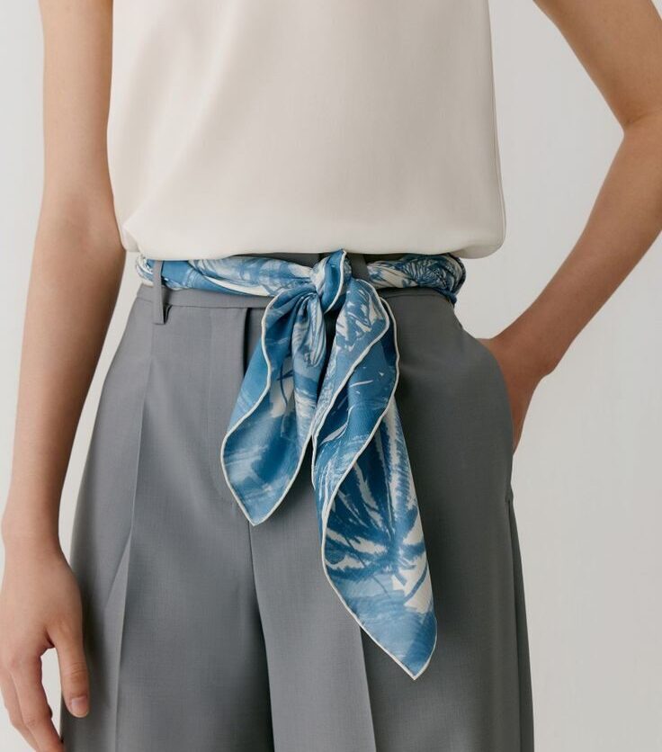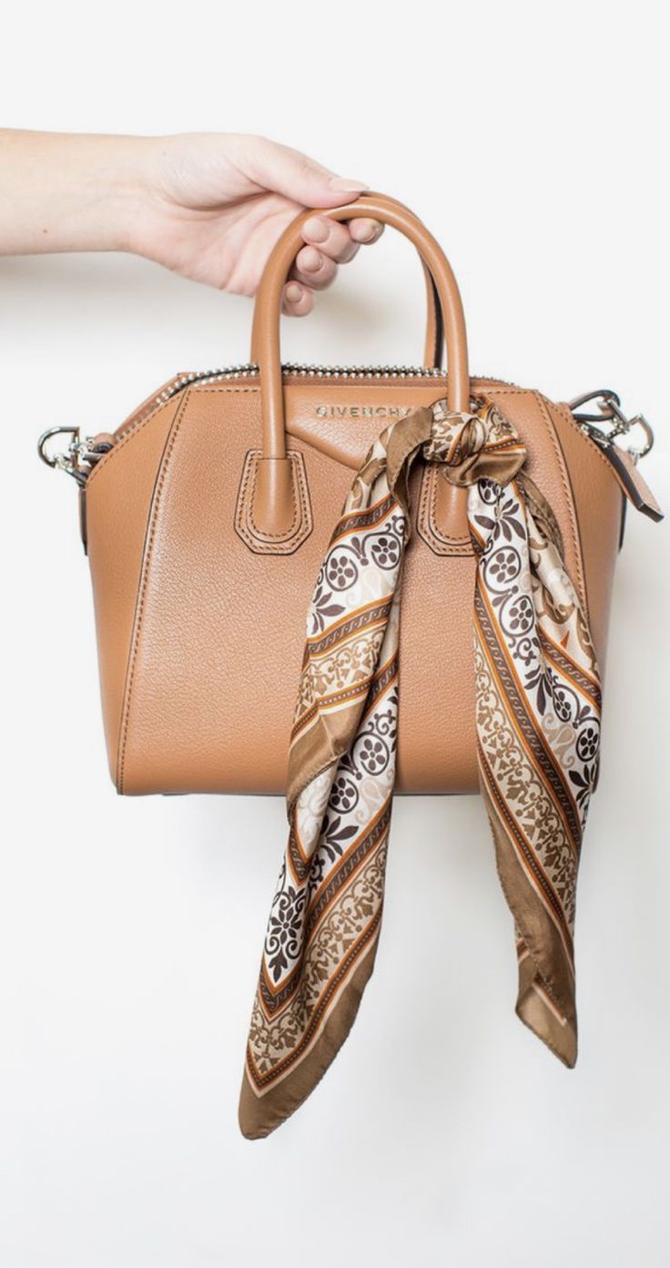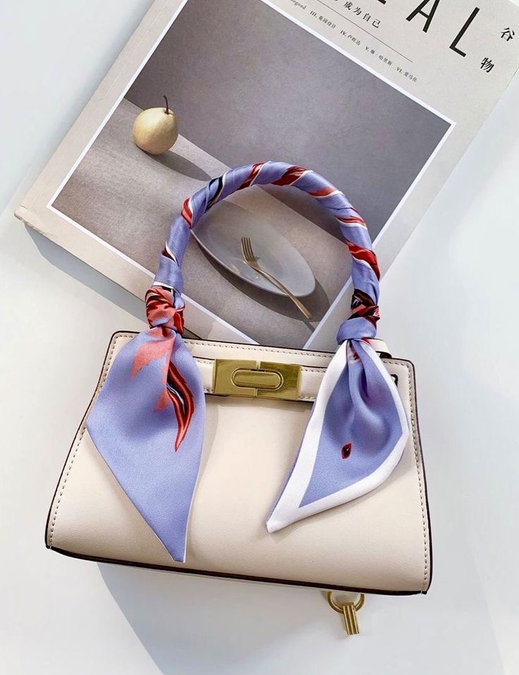 melambangkan keanggunan, kemewahan, dan kehangatan. Scarf ini menambah sentuhan mewah dan klasik pada tas atau outfit Anda. Simpul pada pegangan tas memberi nuansa feminin, stylish, dan personal.