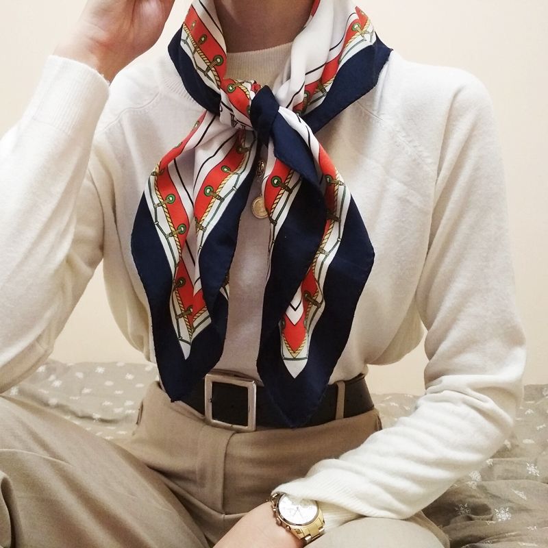 Dengan perpaduan warna navy, merah, dan putih yang bold namun tetap chic, scarf ini cocok digunakan untuk berbagai gaya—baik sebagai aksen di leher, ikat kepala, hingga aksesori tas.
